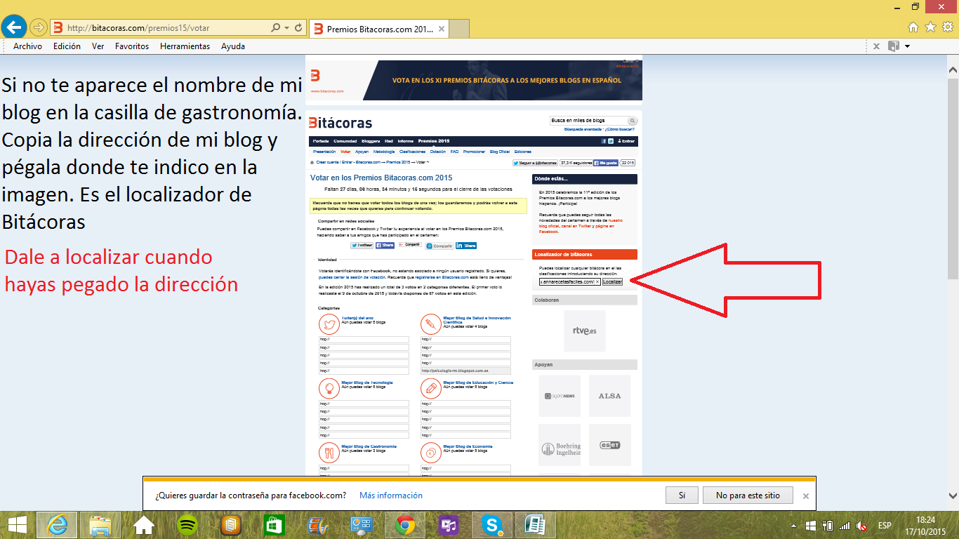 Paso 1. En la imagen de cabecera de esta «RECETA» dice VOTAR AQUÍ puedes pinchar la imagen o el logo de los premios Bitácoras que tienes arriba a la derecha. Desde el teléfono, pincha mi imagen y te resultará más sencillo, ya que no se ve el logotipo de los premios Bitácoras.